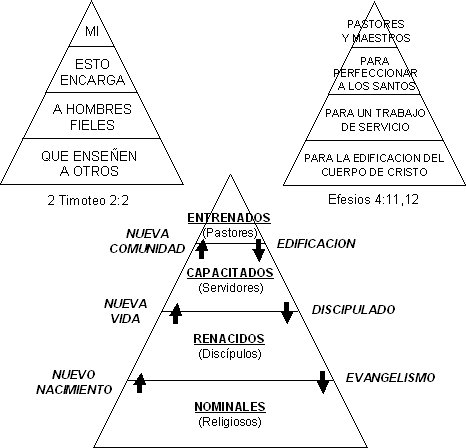 Primer Nivel: Los Religiosos: La gente nueva que llega a la comunidad, supuestamente llega en el nivel inferior. Llega buscando a Dios con el deseo de agradarlo. Y como ya lo explicamos en el capítulo anterior, lo primero que Dios les pide, es que vivan en santidad, esto es, que cumplan los mandamientos de la Ley de Dios. Si bien esto es lo primero que Dios pide, nunca quita, para nada, el dedo del renglón, siempre continúa pidiéndonos santidad. Estas personas, que se encuentran en su etapa de la vida religiosa, tratando de agradar al Señor con sus propias fuerzas, deben ser puestas dentro de un Programa de Evangelismo, en el cual se les enseñe detenidamente cual es el propósito de Dios para el hombre, y en el cual se enfatize la obra que el Señor Jesucristo vino a realizar aquí en la tierra con su muerte y su resurrección de entre los muertos. Este Programa de Evangelismo se concretizará, mediante el ofrecimiento a todos los nuevos miembros, de un Curso de Iniciación a la Vida en el Espíritu. El propósito de este Programa de Evangelismo, debe ser el de llevar a todos aquellos miembros de la comunidad que estén viviendo una vida religiosa, a que experimenten el milagro más grande del mundo, esto es, el Nuevo Nacimiento, y a que sean llenos del Espíritu Santo. Obviamente las personas que participen impartiendo este curso deberán haber tenido antes esta experiencia ellos mismos.