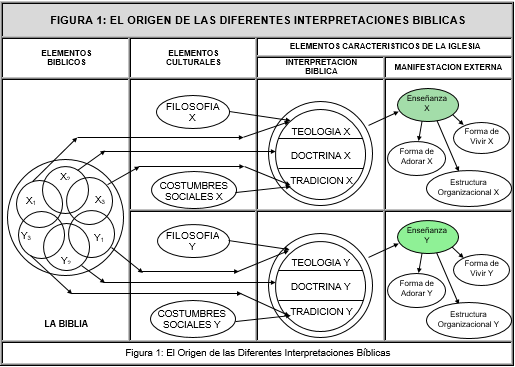La Figura 1: "El origen de las diferentes interpretaciones," de la página 24 ilustra gráficamente como se fueron generando las diferentes interpretaciones de la Biblia, al irse extendiendo el cristianismo por las diferentes regiones del Imperio Romano.