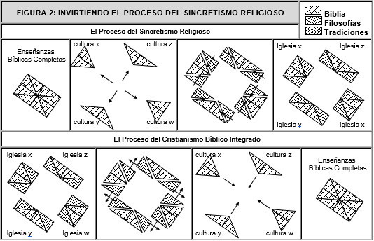 Cuando llega la Biblia a la cultura de la región X, se seleccionan preferentemente las porciones X1, X2 y X3 de la revelación. La porción X1 se mezcla con la Filosofía X para formar la Teología X, la porción X2 pasa a formar la Doctrina X, y la porción X3 se mezcla con las Costumbres Sociales X para formar la Tradición X. Estos tres elementos, la Teología X, la Doctrina X, y la Tradición X constituyen la forma como la Cultura X interpreta la Biblia, y esta Enseñanza X ocasiona una Forma de Vivir X, una Forma de Adorar X, y una Estructura Organizacional X. En el segundo renglón de esa tabla se muestra que algo semejante sucede cuando llega la Biblia a la Cultura Y. Para el año 300 ésta tabla ya tenía más de diez renglones.