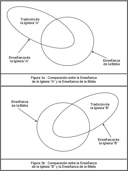 Al comparar las enseñanzas de varias iglesias, o versiones del cristianismo, unas con otras, y con las enseñanzas de la Biblia, utilizando Diagramas de Venn de intersecciones de conjuntos, apreciamos una buena cantidad de información. Ver Figura 5: "Las Tradiciones, las Doctrinas Bíblicas características, y el Cristianismo Básico", de la página 28.