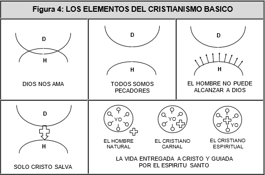 La Figura 4: "Los Elementos del Cristianismo Básico", de la página 27, ilustra gráficamente los conceptos principales del Cristianismo Básico, de una manera sencilla, que puede explicarse fácilmente a cualquier persona, haciendo esos dibujitos en una servilleta, mientras comparten una taza de café.