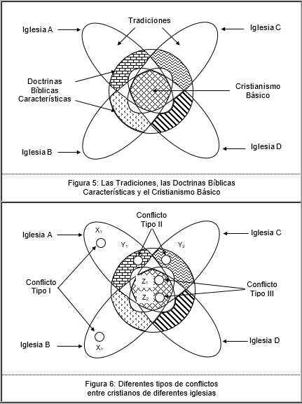 La Figura 6: "Diferentes Tipos de Conflictos entre cristianos de diferentes iglesias", de la página 28 muestra gráficamente los tres tipos de conflictos que se pueden generar entre cristianos de diferentes iglesias. Durante mis once años atendiendo la librería cristiana, observaba esos conflictos con mucha frecuencia. Casi diariamente.