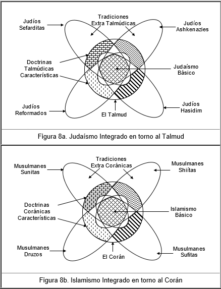 La Figura 8b: "Islamismo integrado en torno al Corán", de la página 30, muestra con diagramas de intersecciones de conjuntos, los tres tipos de regiones que se forman, cuando se comparan las enseñanzas de las diferentes versiones del Islamismo, con las enseñanzas del Corán. La intersección de todos los conjuntos define el Islamismo Básico, o sea el Islamismo común a todos los musulmanes de todas las versiones. Se muestran las regiones que incluyen las enseñanzas distintivas de cada versión. Tomando el ejemplo de la versión de Musulmanes Shiítas, serían sus Doctrinas Coránicas Características, y sus Tradiciones Shiítas ajenas a las enseñanzas del Corán. Y después se podría proceder a buscar una forma de integrar las Doctrinas Coránicas Características, de las diferentes versiones de Islamismo, para desarrollar un Islamismo Integrado. Y de ahí se podría proceder a desarrollar un Plan de Desarrollo de Dios conforme al Corán.