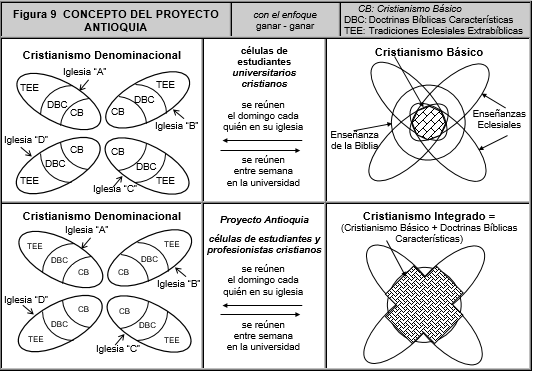 El concepto del Proyecto Antioquía es muy semejante, solo que agrega dos ampliaciones. Una consiste en no limitar la membresía en los grupos, solamente a estudiantes, sino ampliarla para incluir también a maestros y empleados de la universidad que deseen participar. La otra ampliación consiste en no limitar el estudio bíblico solamente al Cristianísimo Básico, sino ampliarlo para incluir también el Cristianismo Integrado, constituido por las Doctrinas Bíblicas Características de las principales versiones del Cristianismo contemporáneo. Como material didáctico para estos grupos de estudio bíblico se recomienda el libro anterior de este mismo autor "El Sistema de Vida en el Espíritu: Entendiendo el Cristianismo".