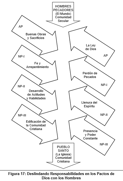 Las cuatro etapas de este proceso de preparación del Pueblo Santo, que Dios espera que nosotros edifiquemos, para que Jesucristo funde el Reino de los Cielos con él, cuando regrese de nuevo, se ilustra gráficamente en la Figura 17: "Deslindando responsabilidades en los pactos de Dios con los hombres", de la página 54.