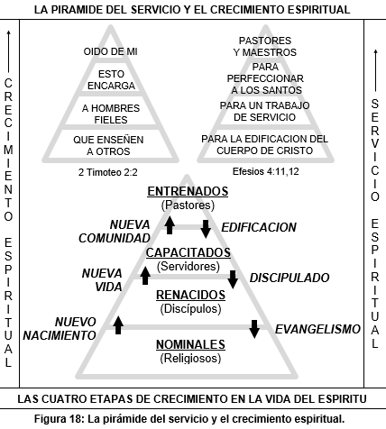 En la Figura 18: "La pirámide del servicio y el crecimiento espiritual", de la página 58 se muestran esos cuatro niveles de servicio, o de crecimiento espiritual. En el nivel más bajo, y más amplio, de la pirámide, están los miembros de la comunidad más inmaduros, los miembros nominales. A esos creyentes nominales se les debe ofrecer un Programa de Evangelismo para que lleguen a experimentar el Nuevo Nacimiento. En el segundo nivel están los miembros que ya nacieron de nuevo, o discípulos, y ahora se les debe ofrecer un Programa de Discipulado para que aprendan a orar y a leer la Biblia, y vivir así una Nueva Vida. En el tercer nivel están los miembros que ya están capacitados para servir y participar en los diferentes ministerios. A estos servidores se les debe ofrecer un Programa de Edificación para que aprendan edificar una Nueva Comunidad. Y en el cuarto nivel están los creyentes más maduros, que edifican a los del tercer nivel, los que a su vez discipulan a los del segundo nivel, los que a su vez evangelizan a los del primer nivel.