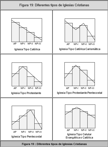 La Figura 19: "Diferentes tipos de Iglesias Cristianas", de la página 61 muestra estos conceptos con diagramas de barras. Y de ahí se aprecia que esos cinco tipos de iglesias tienen la misma área de oportunidad, que es la tercera etapa de Nuevo Pacto, NP3, o la Edificación. La forma de aprovechar esta área de oportunidad fue demostrada por David Yonggi Cho, en Seúl, Corea, en los años 1980s, utilizando grupos pequeños, como enseña el libro de los Hechos, en el Nuevo Testamento, y en la actualidad muchas iglesias de todas las versiones han agregado al servicio dominical tradicional, los grupos pequeños de oración y estudio bíblico, que se reúnen en las casas entre semana.