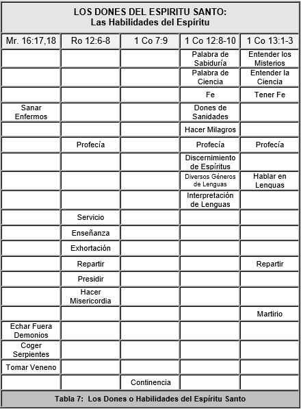La Tabla 7: "Los Dones o Habilidades del Espíritu Santo", de la página 70 muestra 5 pasajes bíblicos que mencionan estos dones o habilidades del Espíritu.