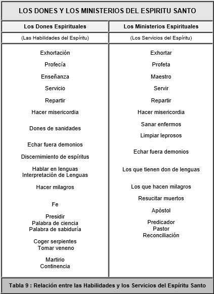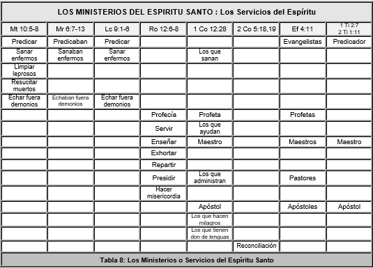 La Tabla 8: "Los Ministerios o Servicios del Espíritu Santo", de la página 71, muestra algunos de estos pasajes bíblicos que mencionan los ministerios del Espíritu.
