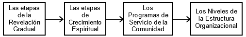 Pero nos estamos adelantando demasiado, pues esto es el final de nuestro estudio. Primero investigaremos las cuatro etapas de la revelación gradual de Dios a través de la Biblia. Después investigaremos como estas cuatro etapas de la revelación de Dios se perciben en forma gradual, por cada persona, conforme a la obediencia, determinando las cuatro etapas de crecimiento espiritual personal. Después investigaremos la forma como estas etapas de crecimiento espiritual personal determinan los tres programas de servicio que debe ofrecer la comunidad de vida cristiana para apoyar a sus miembros que vayan pasando por cada una de estas etapas de crecimiento espiritual. Y después investigaremos los tres niveles de la estructura organizacional apropiados para ofrecer estos tres programas de servicio con eficiencia.