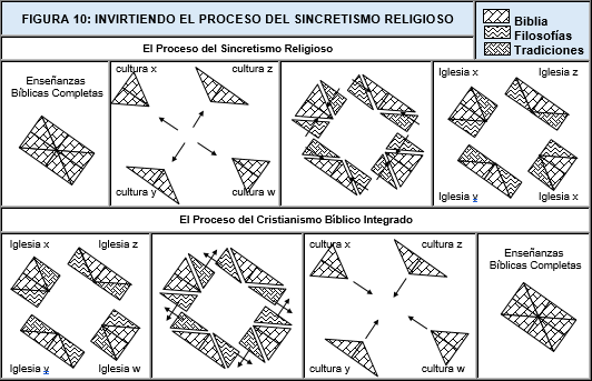 La Figura 10, página 61: "Invirtiendo el Proceso del Sincretismo Religioso" muestra en el primer renglón el proceso original de fragmentación de las enseñanzas de la Biblia y su mezcla con filosofías y tradiciones regionales. Y en el segundo renglón muestra la manera de invertir ese proceso, detectando las filosofías y las tradiciones, y aislando las enseñanzas bíblicas, para reconstruir el Plan de Desarrollo de Dios revelado originalmente.