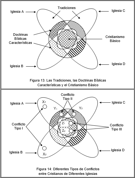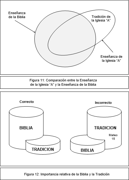 En la Figura 11, página 66, representamos con un círculo a la enseñanza de la Biblia, y representamos con una elipse que se intercepta con el círculo, a la enseñanza de la Iglesia A. De esta figura podemos hacer varias observaciones importantes. Lo primero que observamos es que una parte de la enseñanza de la Iglesia A esta contenida en la enseñanza de la Biblia. También observamos que una parte de la enseñanza de la Iglesia A no proviene de la Biblia; a esta parte le llamaremos la tradición religiosa de la Iglesia A. Y observamos finalmente que hay una parte de la enseñanza de la Biblia que no se incluye dentro de la enseñanza de la Iglesia A.