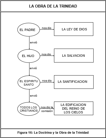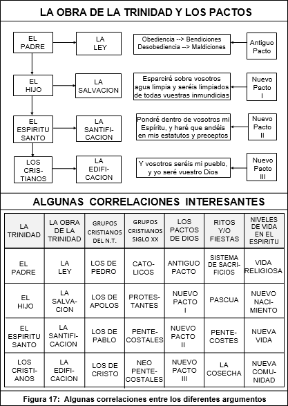 La Figura No. 16, página 84, ilustra gráficamente la Doctrina y la Obra de la Trinidad, mostrando de una forma increíblemente sencilla y a la vez completa, todo el Propósito de Dios para el hombre. La Figura No. 17, página 85, ilustra, mediante dos tablas, las correlaciones que existen entre los diferentes argumentos que nos conducen a bases de DBC's, aparentemente diferentes. Aunque realmente no son diferentes, sino que simplemente constituyen diferentes enfoques de una misma y única base de DBC's que puede generar todo el espacio de Doctrinas Bíblicas Fundamentales.