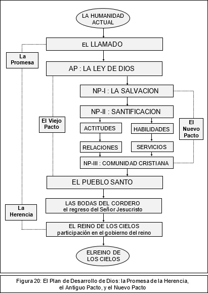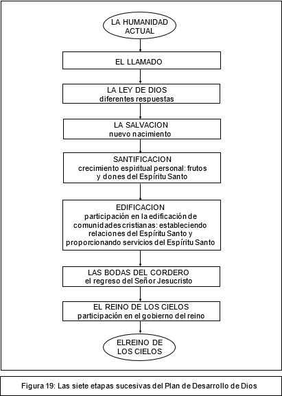 La Figura 19, página 100, ilustra en forma gráfica estas siete etapas del Plan de Desarrollo de Dios; y la Figura 20, página 101, ilustra la forma como se relacionan estas siete etapas con la Promesa, con el Antiguo Pacto, con las tres etapas del Nuevo Pacto, y con la herencia del Reino de los Cielos.