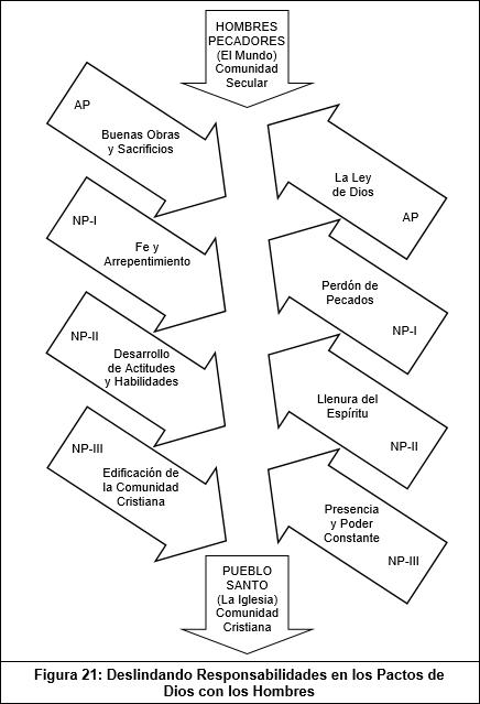 La Figura 21, página 102, ilustra gráficamente el deslinde de responsabilidades en los pactos de Dios con el hombre. La figura representa una maquinaria espiritual hipotética con cuatro pares de pistones horizontales, que podemos imaginarlos oscilando alguna pequeña distancia con respecto a su posición de equilibrio. La entrada de esta maquinaria toma la materia prima, constituida por el mundo actual, lleno de pecadores, y al ir pasando a través de este proceso, se va transformando en el producto final, que debe ser el Pueblo Santo o la Iglesia Gloriosa esperada para Jesucristo.