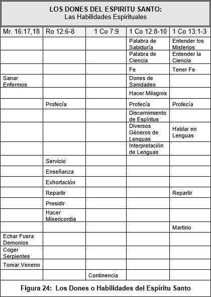 La Figura 24, página 111, muestra en forma de una tabla los cinco pasajes principales del Nuevo Testamento que contienen listas parciales de las Habilidades Espirituales, esto es de las habilidades sobrenaturales que distribuye el Espíritu Santo entre los miembros de una Comunidad de Vida Cristiana, con el propósito de capacitarlos para realizar un trabajo de servicio, para la edificación espiritual de toda la comunidad. Estas habilidades sobrenaturales son comúnmente llamadas Dones del Espíritu Santo.
