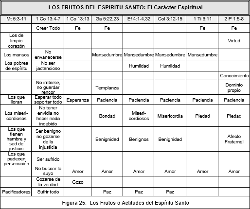 La Figura 25, página 112, muestra en forma de una tabla los ocho pasajes principales del Nuevo Testamento que contienen listas parciales de las Actitudes Espirituales, esto es de las actitudes sobrenaturales que desarrolla el Espíritu Santo entre los miembros de una Comunidad de Vida Cristiana, con el propósito de capacitarlos para establecer vínculos o relaciones entre ellos, para la edificación espiritual de toda la comunidad. Estas actitudes sobrenaturales son comúnmente llamadas Frutos del Espíritu Santo.