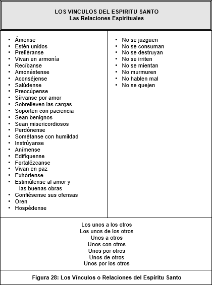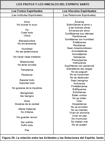 La Figura 28, página 119, muestra en forma de tabla 37 de las Relaciones Espirituales mencionadas en el Nuevo Testamento. Estos pasajes siempre vienen acompañados de la frase "unos a los otros" o algo equivalente, como: "preocúpense unos por otros", o "anímense los unos a los otros". Estas son las relaciones espirituales que deben establecerse entre los miembros de la comunidad de vida cristiana para edificarse espiritualmente unos a otros. Estas relaciones espirituales son comúnmente llamados Vínculos del Espíritu Santo. La Figura 29, página 120, muestra en forma de una tabla con dos columnas la relación que existe entre las actitudes y las relaciones del Espíritu Santo. La primera columna lista los frutos o actitudes del Espíritu, y la segunda columna lista los vínculos o relaciones del Espíritu.