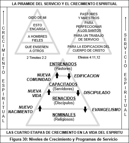 Las interrelaciones que existen entre los diferentes niveles de crecimiento en la vida del Espíritu, y los diferentes programas de servicio que debe ofrecer la Comunidad de Vida Cristiana para fomentar y propiciar el crecimiento espiritual de sus miembros, se ilustran gráficamente en la Figura 30, página 121.