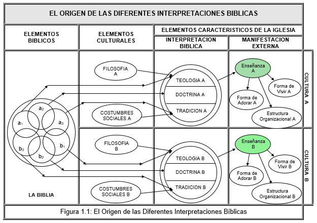 Cuando el cristianismo empezó a extenderse fuera de Jerusalén, la ciudad en donde se originó fue llegando a diferentes provincias del Imperio Romano, las cuales tenían diferentes culturas, caracterizadas por diferentes filosofías y diferentes costumbres sociales. Así que cuando llegó el cristianismo a una cultura "A" algunas enseñanzas "a1" de la Biblia se combinaron con la filosofía A para desarrollar la Teología "A", otras enseñanzas "a2" se dejaron sin modificar y constituyeron la Doctrina "A", y otras enseñanzas "a3" se mezclaron con las costumbres sociales "A" para integrar la Tradición "A". Estas Teología "A", Doctrina "A", y Tradición "A" constituían la enseñanza del cristianismo en la cultura "A". Podríamos entonces decir que esa era la forma en que la cultura "A" interpretaba la Biblia. Ahora bien, esta Enseñanza "A" del cristianismo tenía como fruto, o como consecuencia, una forma de vivir "A", una forma de adorar "A", y una estructura organizacional "A". Ver la ilustración gráfica de estos conceptos en la Figura 1.1 de la página 16.