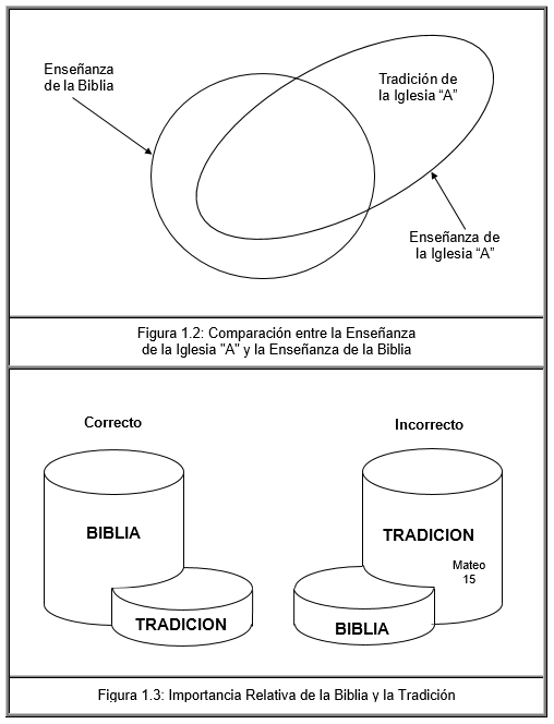 La Figura 1.3, de la página 17, muestra gráficamente dos diferentes situaciones que pueden darse en la práctica. En el caso "A" se muestra la situación en que se le da mayor importancia a las enseñanzas bíblicas con respecto a las enseñanzas de la tradición, por considerarse que las enseñanzas bíblicas están basadas en la revelación de Dios, y las enseñanzas de la tradición están basadas en filosofías y costumbres humanas dependientes de la cultura. En el caso "B" se le da mayor importancia a las tradiciones humanas con respecto a la revelación de Dios, y de acuerdo al Señor Jesucristo esto no debe de hacerse: