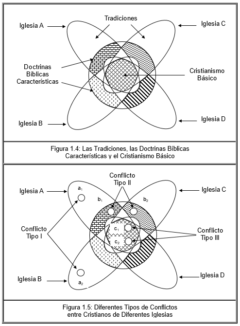 La Figura 1.5, de la página 18, al final del capítulo, ayuda a entender la explicación de esta sección. Los conflictos Tipo I se generan cuando un miembro de la Iglesia "A" que solamente conoce un poco de sus tradiciones, representado por el pequeño círculo "a1", se encuentra con un miembro de la Iglesia "B" que solamente conoce un poco de las tradiciones de su iglesia, representado por el círculo "a2" y empiezan a platicar sobre religión. El miembro de la Iglesia "A" empieza a platicar de Calvino y de Lutero, mientras que el miembro de la Iglesia "B" empieza a platicar de San Agustín y de Santo Tomás. Después de algún tiempo de platicar se dan cuenta de que están platicando de cosas muy diferentes y se genera un conflicto Tipo I de baja intensidad. Después de todo ninguno de los cuatro personajes referidos viene mencionado en la Biblia.