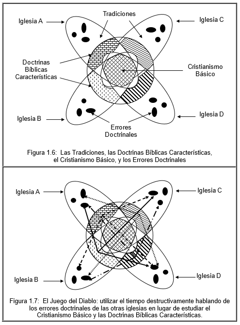 La consecuencia obvia de esta serie de eventos es que se ofenden unos a otros, de modo que todos terminan enojados, y nadie gana nada, excepto el diablo, el cual ha logrado que en lugar de que los involucrados emplearan el tiempo constructivamente estudiando el Cristianismo Básico, se enfrascaran discutiendo sobre los errores doctrinales, los cuales están totalmente fuera de su alcance el poderlos corregir. Este juego del diablo se ilustra gráficamente en la Figura 1.7 de la página 19.