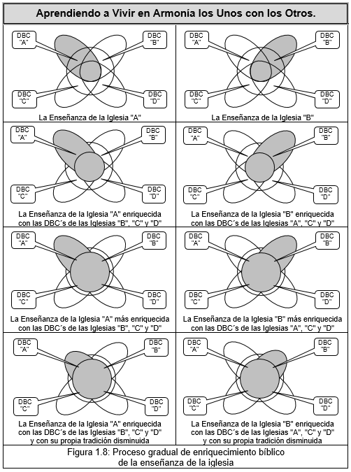 Algo semejante ocurrió cuando el cristianismo original de Jerusalén llegó a la cultura "B". Sucedió que algunas enseñanzas "b1" de la Biblia se combinaron con la filosofía "B" para desarrollar la Teología "B", otras enseñanzas "b2" se dejaron sin modificar y constituyeron la Doctrina "B", y otras enseñanzas "b3" se mezclaron con las costumbres sociales "B" para integrar la Tradición "B". Estas Teología "B", Doctrina "B", y Tradición "B" constituían la enseñanza del cristianismo en la cultura "B". Podríamos entonces decir que esa era la forma en que la cultura "B" interpretaba la Biblia. Ahora bien, esta Enseñanza "B" del cristianismo tenía como fruto, o como consecuencia, una forma de vivir "B", una forma de adorar "B", y una estructura organizacional "B". Ver la ilustración gráfica de estos conceptos en la Figura 1.1, de la página 16.