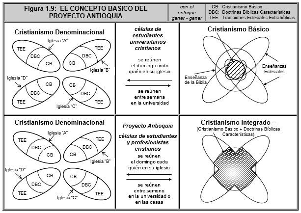 En la sección 2.4 definimos las Doctrinas Bíblicas Características de una iglesia X, como aquellas doctrinas bíblicas que se enseñan exclusivamente en la iglesia X. El concepto del Proyecto Antioquía consiste en extender de dos maneras ese modelo de los estudiantes universitarios de diferentes iglesias, que se reúnen para estudiar el Cristianismo Básico entre semana, sin dejar de asistir a los servicios dominicales de sus propias iglesias. Una de las maneras consiste en no limitar la membrecía solamente a estudiantes universitarios. Sino extenderla para incluir a profesionistas cristianos de diferentes iglesias. Y la otra manera de extender ese modelo consiste en no limitar el estudio bíblico solamente al Cristianismo Básico, sino ampliarlo para incluir también las Doctrinas Bíblicas Características de las diferentes iglesias o versiones del cristianismo. Este concepto se ilustra gráficamente en la Figura 1.9 de la página 21.