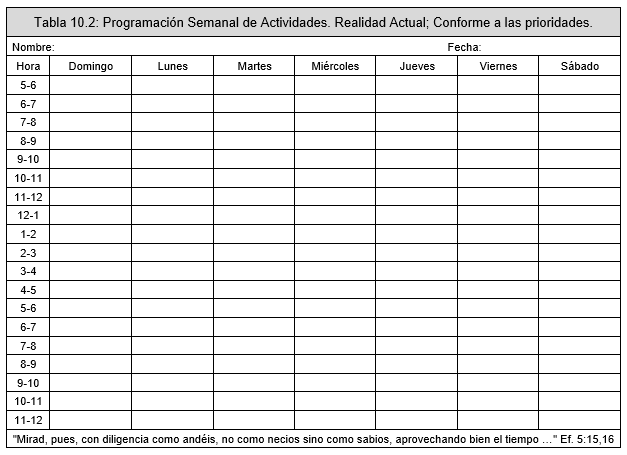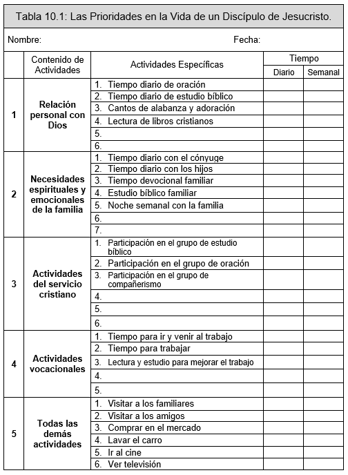 Para ayudarnos a organizar nuestro tiempo y nuestras actividades de manera que estén de acuerdo con la voluntad de Dios nuestro Señor, es muy importante tener bien claras en la mente cuales deben ser las prioridades de un buen discípulo de Jesucristo. Conviene imprimir por duplicado la Tabla 10.1 "Las Prioridades en la Vida de un Discípulo de Jesucristo", de la página 191, para llenar la primera copia con los datos reales actuales y la segunda copia con los datos reordenados conforme a las prioridades y conforme a la Tabla 10.2 "Programación Semanal de Actividades", de la página 192, que explicaremos más adelante.