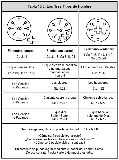 Ver la Tabla 10.3, de la página 193, con los diagramas de los tres tipos de hombres: (1) el hombre natural, (2) el cristiano carnal, y (3) el cristiano verdadero.