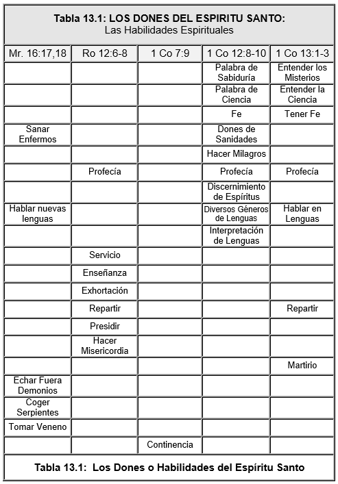 Existen diferentes formas de analizar o clasificar los dones espirituales, Algunas versiones del Cristianismo consideran solamente los nueve dones descritos en 1 Corintios 12, y los clasifican en tres categorías. Un análisis o clasificación más general de los dones del Espíritu fue propuesta por Peter Wagner en su popular libro "Sus dones espirituales pueden ayudar a su iglesia a crecer." Wagner pone en una sola categoría los veinticinco dones descritos en 1 Corintios 12, Romanos 12, Efesios 4, 1 Pedro 4 y algunos otros pasajes como 1 Corintios 13 y Marcos16. La Tabla 13.1 "Los Dones del Espíritu Santo", de la página 234, muestra cinco pasajes bíblicos con algunos de esos dones. En el Capítulo 15 "Descubriendo sus Dones Espirituales" estudiaremos sus definiciones y los pasajes bíblicos que los describen. Veamos a continuación algunos de los pasajes que mencionan los dones del Espíritu de Dios.