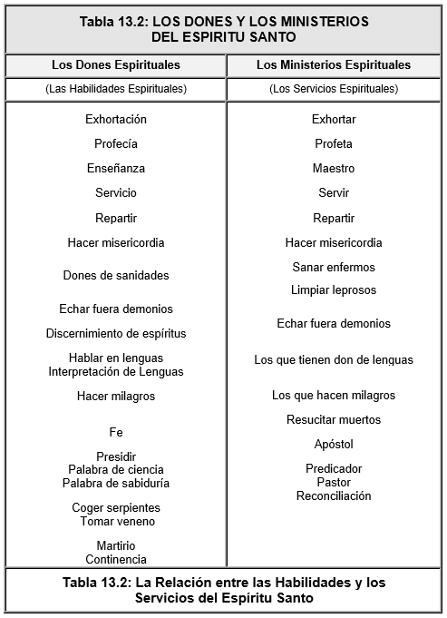 Siguiendo la clasificación de Hodges se puede elaborar una tabla de dos columnas en donde se enlistan los dones del Espíritu en la primera columna y los correspondientes ministerios o servicios espirituales en la segunda columna, como se muestra en la Tabla 13.2: "Los Dones y los Ministerios del Espíritu Santo", de la página 235. De acuerdo con esta clasificación, el don de enseñanza lo confiere Dios a algunos miembros de la comunidad para desempeñar el ministerio o servicio de maestro, a otros les concede el don de profecía para desempeñar el servicio de profeta, a otros el don de sanidad para desempeñar el ministerio o servicio de sanar a los enfermos, etc. Veamos ahora algunos de los pasajes que mencionan los ministerios o servicios del Espíritu.