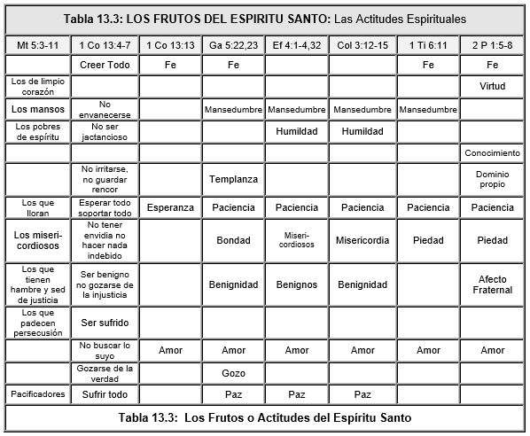 Los frutos del Espíritu, o actitudes sobrenaturales generadas por el Espíritu de Dios, se describen en varios pasajes del Nuevo Testamento. La Tabla 13.3 "Los Frutos del Espíritu Santo", de la página 236, menciona ocho de estos pasajes, si bien el pasaje más conocido es el de Gálatas 5:22,23 que los contrasta después de mencionar las obras de la carne.