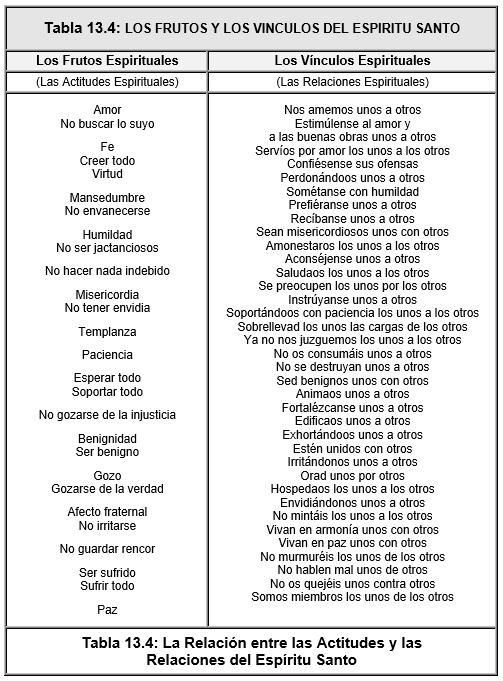 En forma semejante a como el don de profecía lo ofrece Dios para desempeñar el servicio de profeta, y el don de enseñanza para desempeñar el servicio de maestro, también así sucede con los frutos. Dios nos ofrece los frutos del amor y de la paciencia para nuestro crecimiento personal en santidad, pero después Dios espera que compartamos esos frutos desarrollando relaciones espirituales para edificar a los demás miembros de la comunidad. La forma de hacerlo es amándonos unos a los otros y siendo pacientes los unos con los otros. La Tabla 13.4 "Los Frutos y los Vínculos del Espíritu Santo", de la página 237, muestra cómo se relacionan los frutos o actitudes espirituales, con los vínculos o relaciones espirituales.