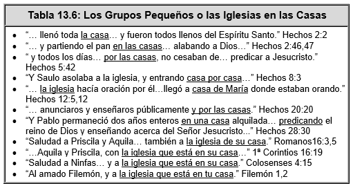 Y en la categoría de planes de acción vamos a estudiar, en el capítulo 16 "La Edificación de la Comunidad Cristiana", la importancia que tienen los grupos pequeños para que todos los miembros del grupo puedan participar activamente durante las reuniones, edificándose unos a otros, y la importancia de que estos grupos de estudio bíblico se formen de acuerdo con las diferentes etapas de crecimiento de sus miembros. La Tabla 13.6 "Los Grupos Pequeños o las Iglesias en las Casas", de la página 239, y la Tabla 13.7 "Etapas Bíblicas de Crecimiento Espiritual", de la página 240, muestran estos planes de acción.
