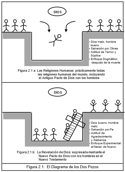 Este concepto, o modelo, de la religión se ilustra en el Diagrama de los Dos Pozos de la Figura 2.1a, de la página 39. Este es el concepto de la mayoría de las religiones. De acuerdo a este modelo: a) Dios es malo y el hombre es bueno; Dios es malo porque quiere echar a los hombres en el pozo, y el hombre es bueno porque está fuera del pozo; b) la salvación es por obras, es decir, si te portas bien y haces buenas obras Dios no te echa en el pozo; c) produce una actitud de temor y súplica, pues te da miedo acercarte a Dios ya que tal vez saque tu lista de malas acciones y te eche en el pozo; y d) este enfoque es dogmático, no es experimental, pues las consecuencias de irte al cielo o al infierno sólo vienen después de la muerte, por lo tanto no puedes hacer una prueba para ver si funciona o no el modelo.