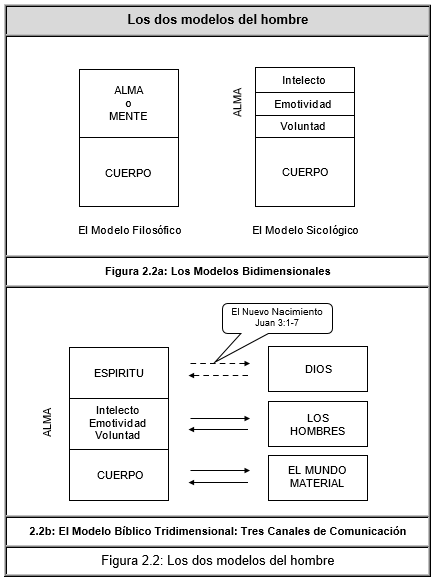De acuerdo con la Biblia el ser humano está constituido por tres elementos, no solamente dos, esto es, el cuerpo, el alma y el espíritu. El cuerpo, mediante los órganos de los sentidos, nos permite detectar, percibir, y comunicarnos con el mundo material, esto es, con los seres inanimados. El alma, mediante sus tres facultades del intelecto, la emotividad, y la voluntad nos permite comunicarnos con los otros seres humanos a través del lenguaje. Y el espíritu, es el sistema de intercomunicación que nos permite percibir, detectar, y comunicarnos con Dios. Como lo veremos en detalle más adelante, ese sistema de intercomunicación lo recibimos desde el nacimiento, pero en estado inactivo, o con muy baja sensibilidad, y puede activarse e incrementar su sensibilidad en gran manera mediante la experiencia de la conversión, o nuevo nacimiento, es decir mediante el nacimiento en el mundo espiritual. Este modelo tridimensional bíblico está ilustrado en la Figura 2.2b, de la página 40.