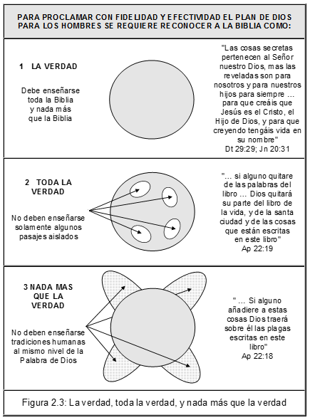 Es por demás interesante que la Biblia establece exactamente este mismo criterio para que sus enseñanzas puedan cumplir con eficiencia los objetivos que Dios pretende alcanzar. En el último capítulo del último libro de la Biblia, el Señor Jesucristo mismo establece que: "Yo testifico a todo aquel que oye las palabras de la profecía de este libro: Si alguno añadiere a estas cosas, Dios traerá sobre él las plagas que están escritas en este libro. Y si alguno quitare de las palabras del libro de esta profecía, Dios quitará su parte del libro de la vida, y de la santa ciudad y de las cosas que están escritas en este libro." Apocalipsis 22:18,19. Esta enseñanza bíblica está ilustrada gráficamente en la Figura 2.3 de la página 41.