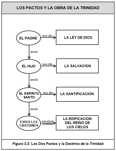 Este Plan de Desarrollo de Dios para transformar aquella parte de la humanidad que decida participar en su proyecto, puede explicarse de una manera equivalente y un poco más sencilla, como se ilustra en la Figura 3.2: "Los Dos Pactos y la Doctrina de la Trinidad", de la página 71.