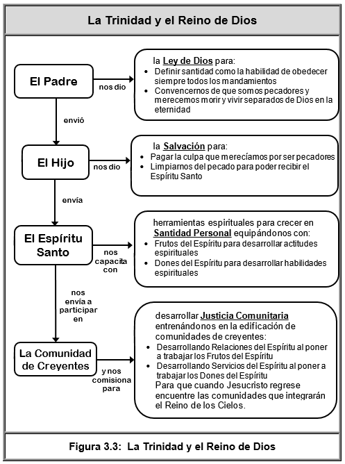 Con un poco más de detalle, esta relación entre las etapas sucesivas de los pactos, la Doctrina de la Trinidad, y el Reino de los Cielos, se ilustra en la Figura 3.3: "La Trinidad y el Reino de Dios", de la página 72. Y en forma de un mapa conceptual se ilustra en la Figura 3.4, de la página 73.