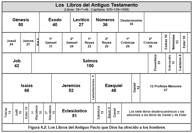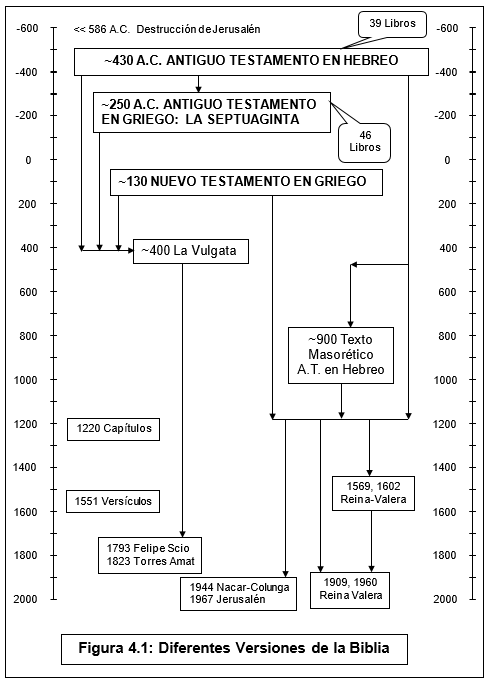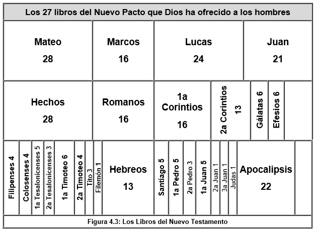 El diagrama de la Figura 4.1 muestra las diferentes versiones de la Biblia y su evolución en el tiempo. El diagrama de la Figura 4.2 muestra los libros del Antiguo Testamento a escala, de acuerdo con el número de sus capítulos, dentro de un librero. En el quinto estante están los libros deuterocanónicos. El diagrama de la Figura 4.3 muestra, también a escala, los libros del Nuevo Testamento.