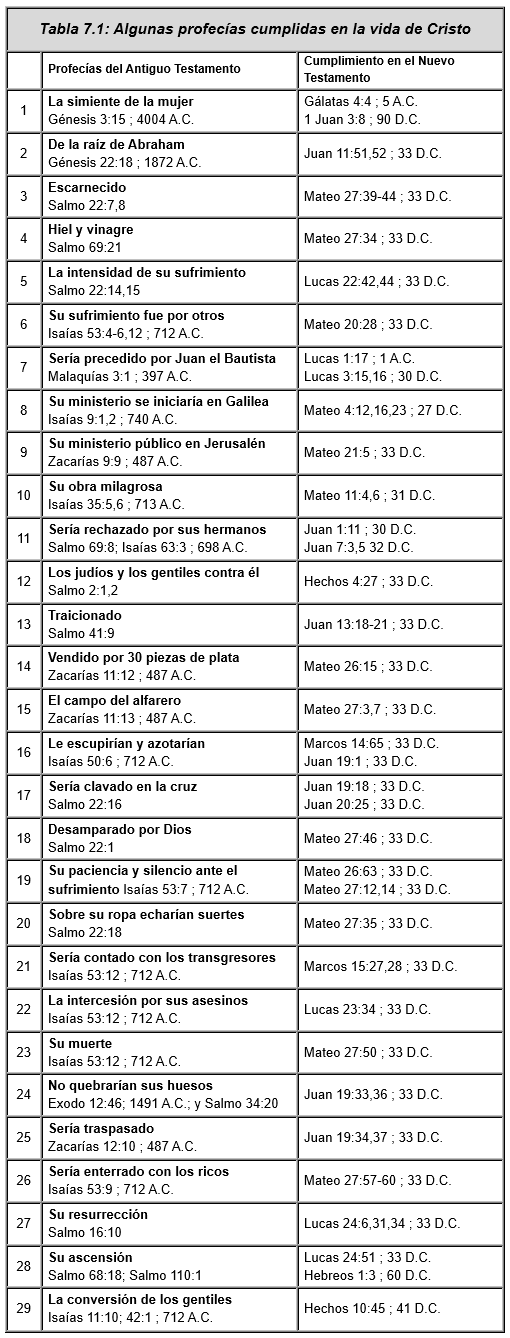En la Tabla 7.1, de la página 145, al final de la lección se proporcionan varias de las profecías cumplidas en la vida de Cristo, mostrando los pasajes del Antiguo Testamento en donde fueron emitidas y los pasajes del Nuevo Testamento en donde se cumplieron. Varios sitios de Internet listan más de 300 profecías cumplidas durante la vida de Jesucristo.