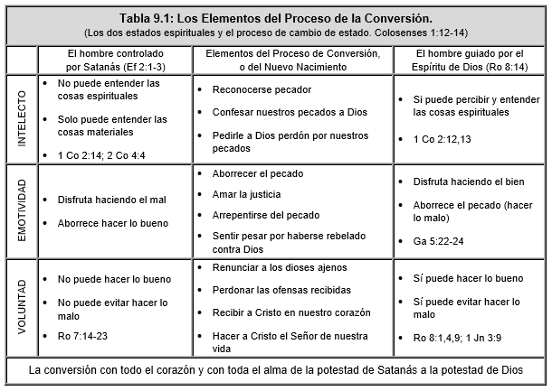 Recordemos brevemente los diferentes elementos que intervienen en el proceso de la conversión o nuevo nacimiento. Hemos visto que la Biblia enseña que la conversión debe efectuarse con "con todo el corazón y con toda el alma". Así que la conversión debe de llevarse a cabo con las tres facultades del alma. Debemos convertirnos con el intelecto, convertirnos con la emotividad, y convertirnos con la voluntad. Conviene ver la Tabla 9.1, de la página 177, antes de continuar con el resto de la lección, para repasar estas enseñanzas en forma gráfica.